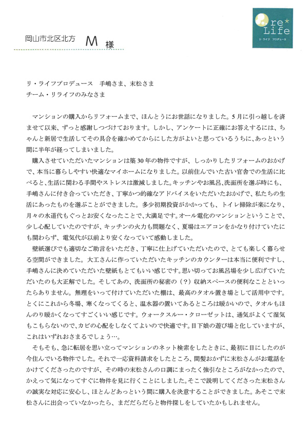 ☆マンションリノベーションをご依頼くださいましたM様。奥様、旦那様からそれぞれ嬉しいお声が届きました。思い通りの住まいが実現でき、ご満足いただけて本当に良かったです。末長くよろしくお願いします。